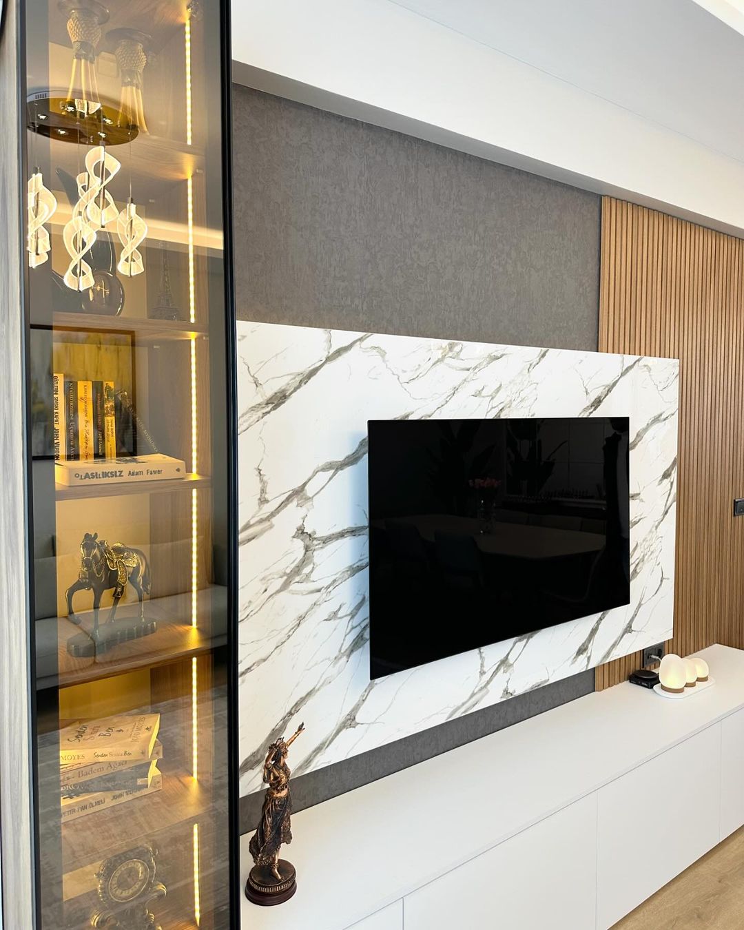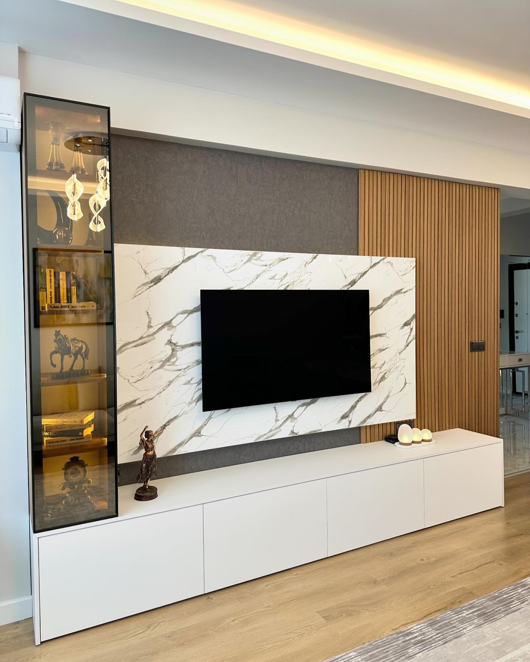 Bilgin Grup olarak, zarif ve modern tasarımlarla yaşam alanlarınızı dönüştürmek için buradayız. Tasarlayıp uyguladığımız bu şık TV ünitesi, mermer desenli yüzeyi, ahşap detayları ve geniş depolama alanıyla hem estetik hem de fonksiyonel bir çözüm sunuyor. Bursa'nın önde gelen tasarım ve uygulama firmalarından biri olarak, her detayı özenle düşünülmüş bu TV ünitesiyle yaşam alanlarınıza değer katıyoruz.